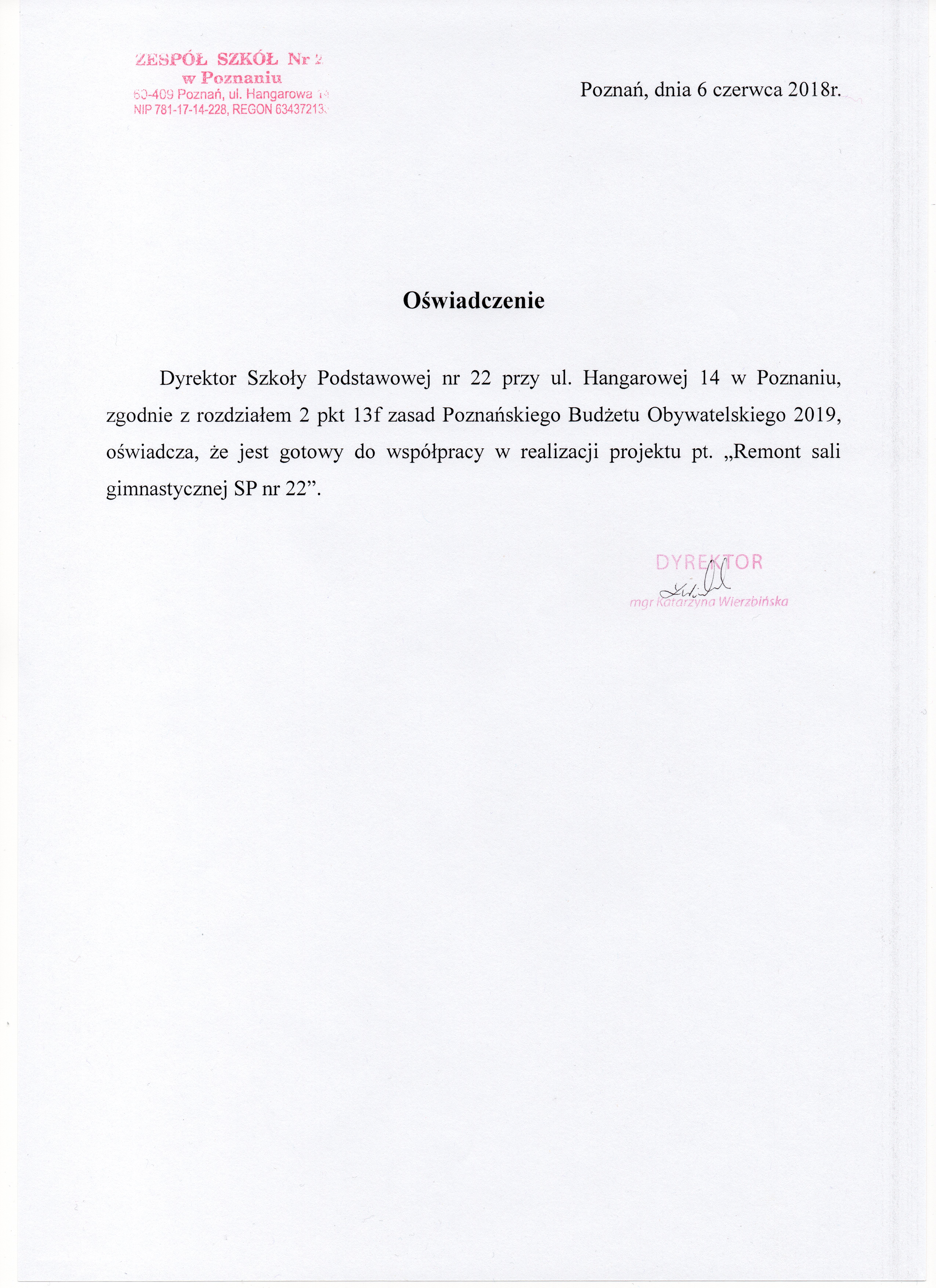 Uzasadnienie: Wskazana lokalizacja znajduje się w zasobie nieruchomości Miasta Poznania. Właściwym do zaopiniowania jest Wydział Oświaty.