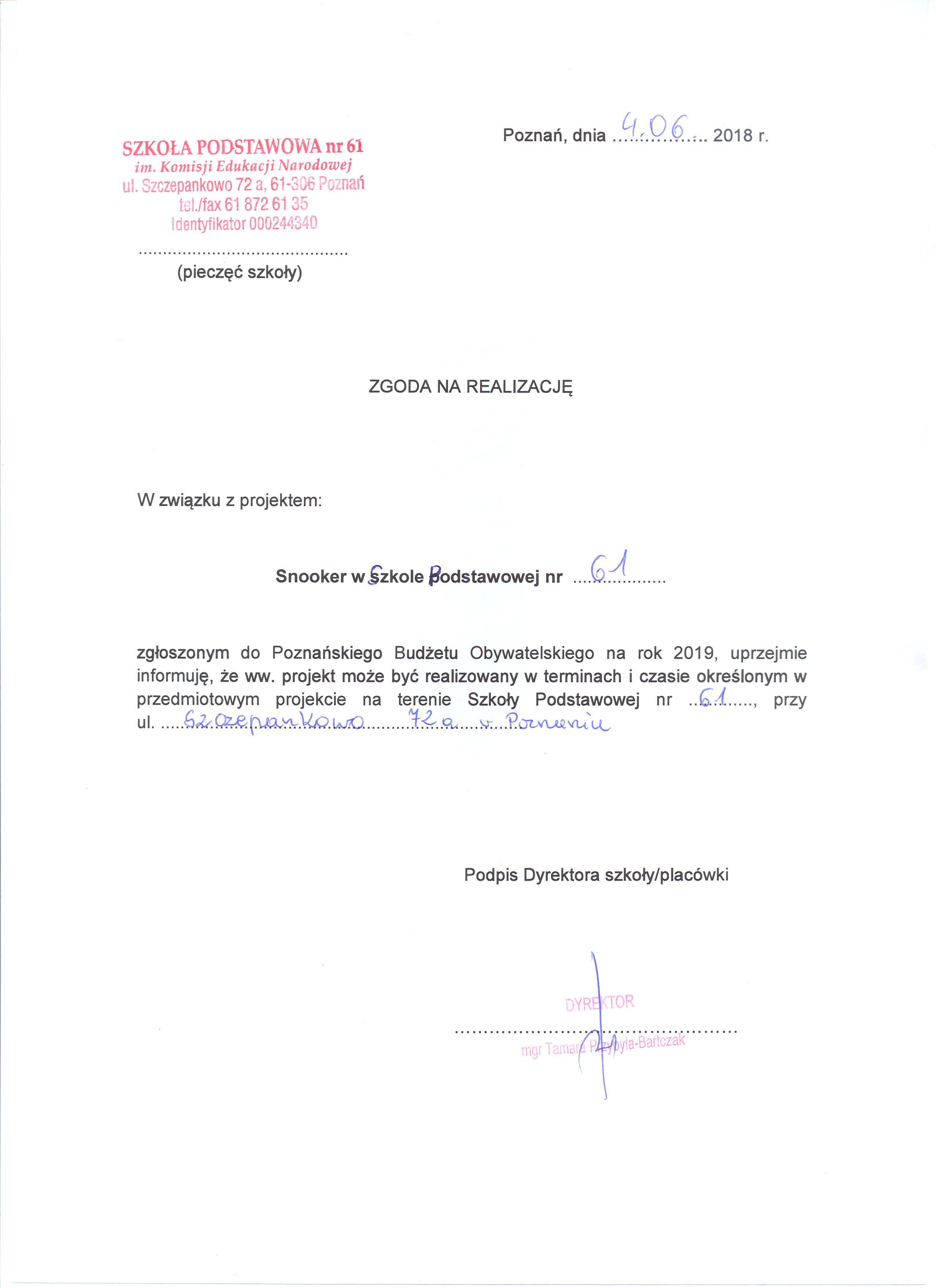 3. Zgodność z przyjętą strategią i programami Miasta - Czy w dniu zgłoszenia projekt jest zgodny ze obowiązującą Strategią i programami Miasta Poznania? - tak4. Zadanie przewidziane do realizacji w Budżecie Miasta lub Wieloletniej Prognozie Finansowej - Czy proponowane zadanie jest już uwzględnione w Budżecie Miasta lub Wieloletniej Prognozie Finansowej? - nie5. Współpraca instytucjonalna - Czy projekt wymaga współpracy instytucjonalnej? - tak- Czy osoby odpowiedzialne za kierowanie daną instytucją przedstawiły wyraźną pisemną gotowość do współpracy w formie oświadczenia? - tak6. Założenie o wykonaniu tylko jednego elementu - Czy projekt zakłada wykonanie wyłącznie jednego z elementów (etapów) realizacji zadania (np. dokumentacji projektowej), które w latach kolejnych będzie wymagało wykonania dalszych jego elementów (etapów), nieuwzględnionych we wniosku na dany rok? - nie7. Realizacja zadania w budynku będącym własnością Miasta - Czy projekt dotyczy budynku będącego własnością Miasta, w którym prowadzona jest działalność komercyjna (nie dotyczy działalności dotowanej przez Miasto), przez którą rozumie się działalność prowadzoną w celu osiągania zysków? - nie8. Komercyjność projektu - Czy projekt ma charakter komercyjny tzn. wynika z niego, że można z niego czerpać bezpośrednie korzyści finansowe (przychody) w związku z realizacją projektu? - nie9. Możliwość realizacji zadania w przeciągu kolejnego roku budżetowego? - Czy możliwa jest realizacja zadania w trakcie roku budżetowego 2019 lub – w przypadku projektów inwestycyjnych, których realizacja wymaga przeprowadzenia czynności przygotowawczych, polegających np. na sporządzeniu dokumentacji projektowej lub pozyskaniu m.in. stosownych pozwoleń, uzgodnień oraz opinii – w trakcie kolejnego roku budżetowego? - tak10. Projekt zakładający budowę pomnika lub innych form upamiętnienia - Czy projekt zakłada budowę pomnika/pomników lub innych form upamiętnienia regulowanych przez odrębne przepisy? - nie11. Zgodność z przepisami prawa - Czy projekt narusza obowiązujące przepisy prawa, prawa osób trzecich, w tym prawa własności, ochrony wizerunku i dobrego mienia? - nie12. Realizacja na terenie miasta Poznania - Czy miejsce realizacji projektu wykracza poza teren Miasta Poznania? - nieKOSZTY Koszt projektu (kwota w zł) - określony przez Wnioskodawcę - 50 168 złKoszt utrzymania projektu w kolejnych 5 latach określony przez Wnioskodawcę - 15 050 złA. Czy wymagany budżet całkowity na realizację projektu jest zgodny z limitami finansowymi wskazanymi w Zasadach PBO19? - takB. Czy łączny koszt utrzymania projektu w kolejnych 5 latach przekracza 30% wartości zgłoszonego projektu? - nie