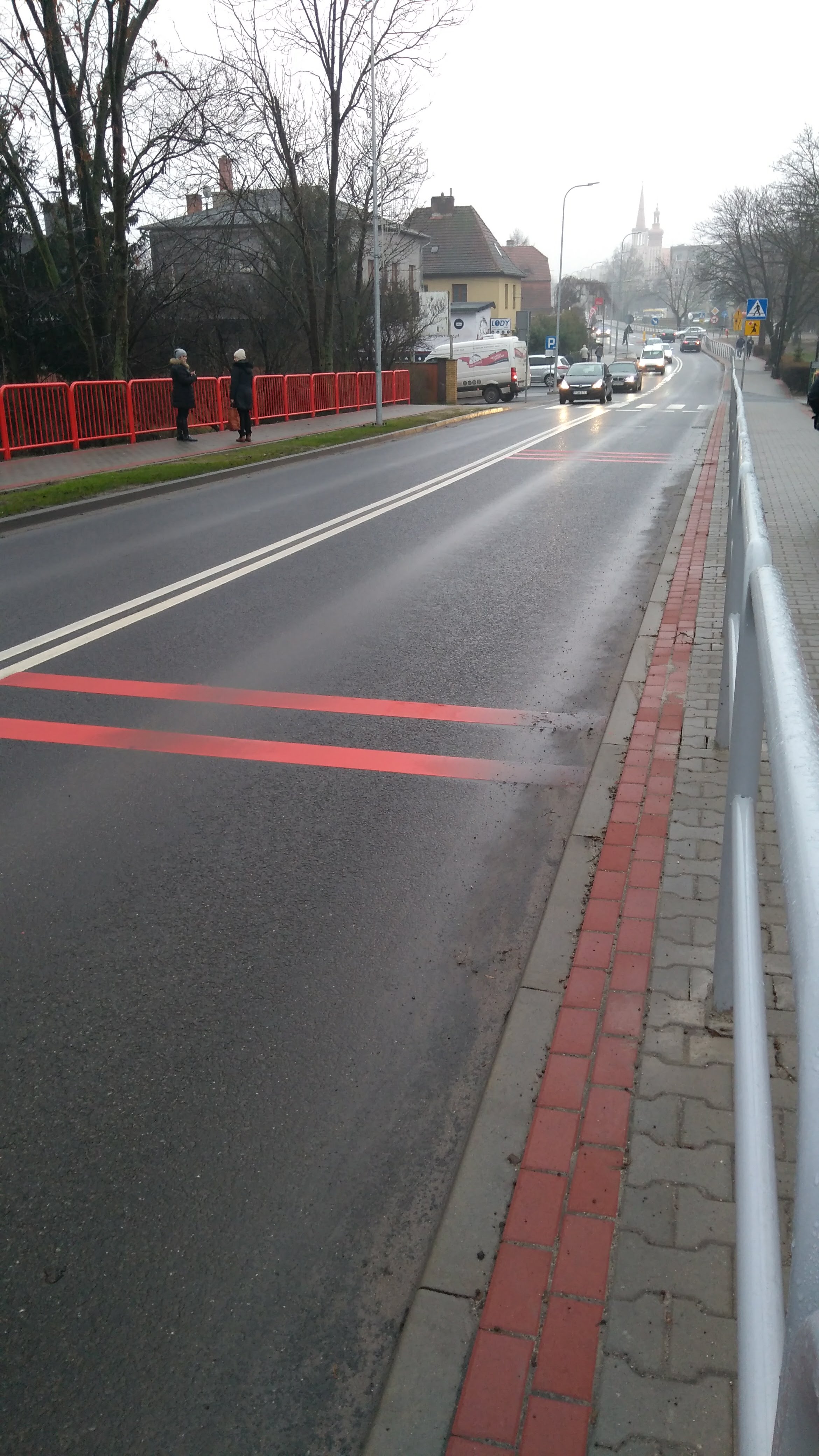 Oznakowanie przejść dla pieszych, wykonane na asfalcie z naklejanych wypukłych czerwonych pasów.
